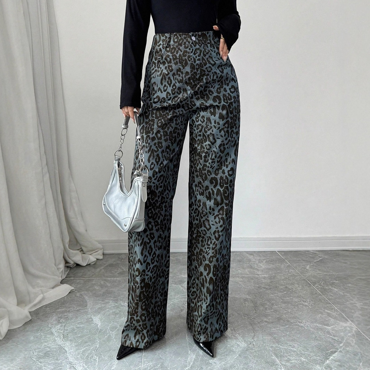 Stylish high-waisted wide-leg pants with leopard print, perfect for autumn and winter wear. Comfortable and trendy for seasonal fashion.