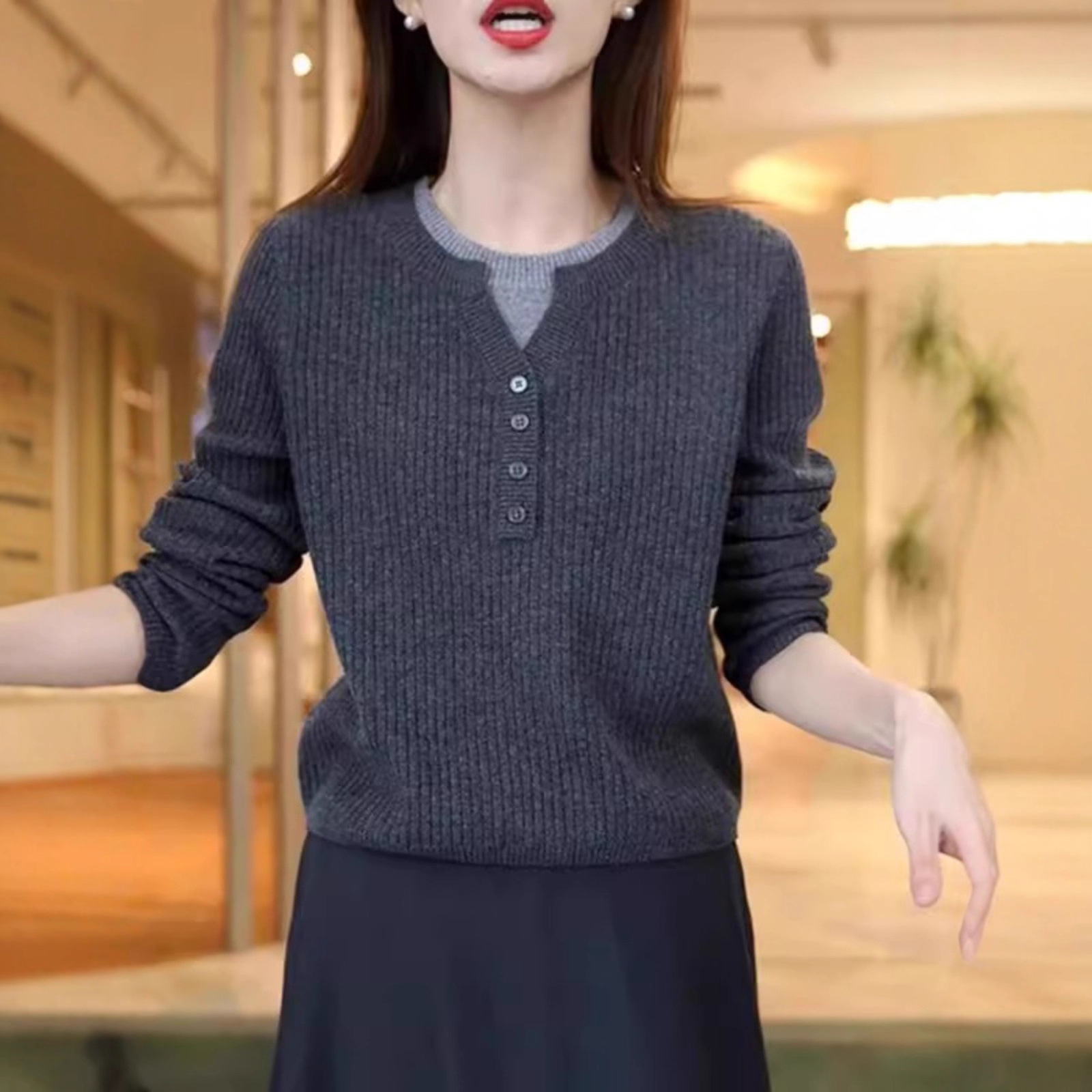 This women’s sweater is designed for autumn and winter wear, featuring a round neck and a distinctive fake two-piece knitted style. Crafted to provide warmth and comfort, the sweater includes padding for additional insulation. Its layered appearance combines a knitted top with integrated padding, offering both style and functional warmth during colder seasons. The garment ensures a snug fit and adds a fashionable touch to any casual or semi-casual outfit.