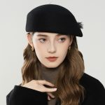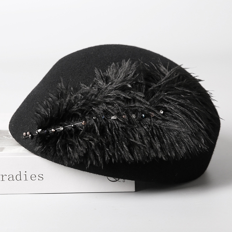 Stylish autumn and winter wool beret featuring retro design and feather decoration for elegant cold-weather fashion.
