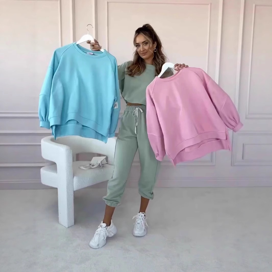 Comfortable autumn and winter solid color loose sweater and pants two-piece suit for casual wear.