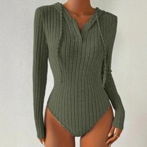 Cozy autumn jumpsuit featuring knitted fabric, fleece lining, hood, and sunken stripe design in solid colors for comfortable casual wear.