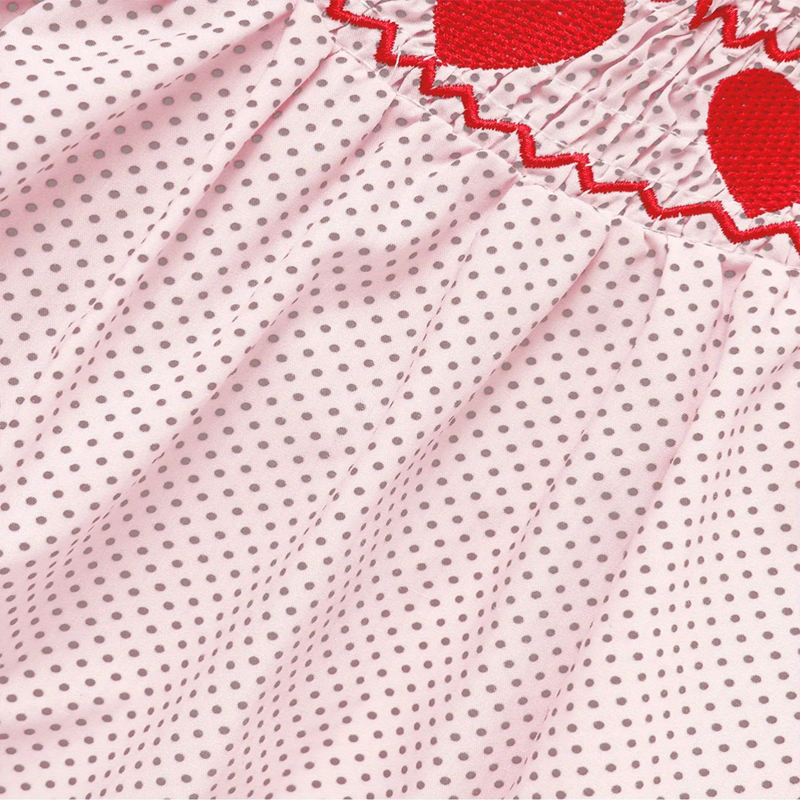 Soft baby girl romper with short sleeves, pink polka dot design, heart embroidery, and delicate ruffle accents for comfort and style.