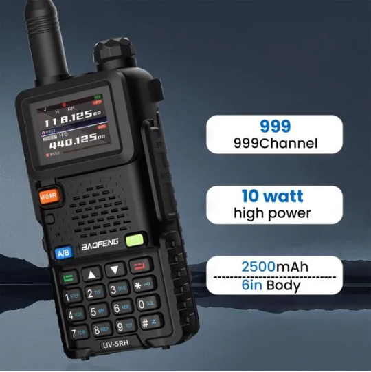 High-power BAOFENG UV-5RH GMRS ham radio with 10W output, long-range, USB-C charging, 999 channels, and vibrant LCD display for versatile communication.