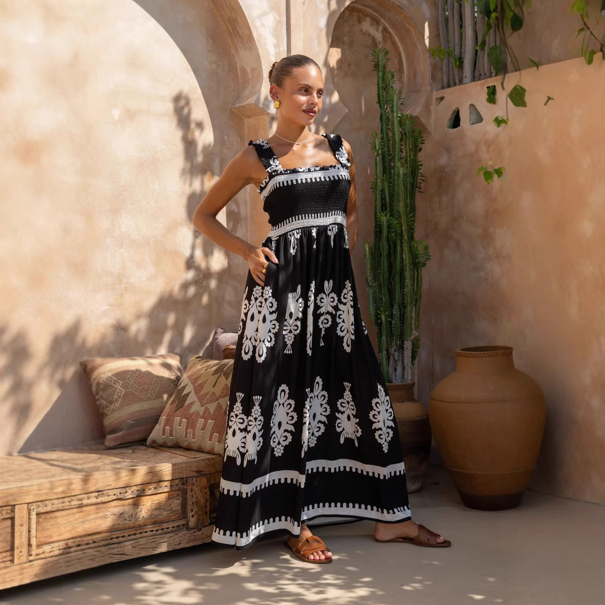 Lightweight strapless beach dress with stylish vacation print, perfect for summer outings and holiday wear.