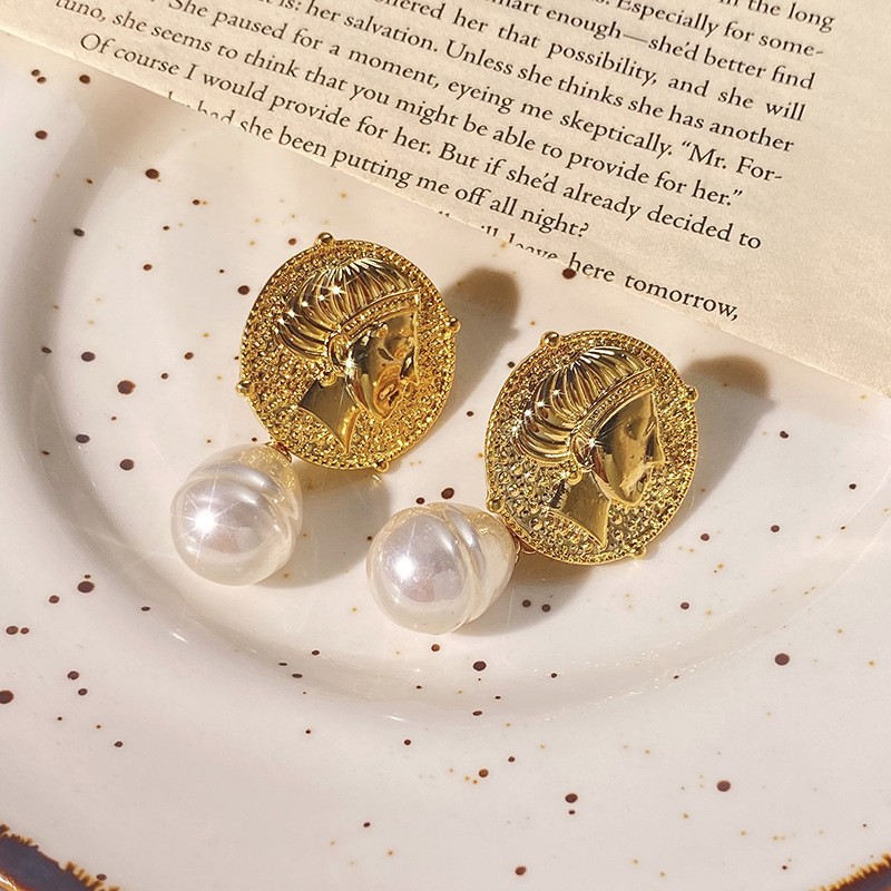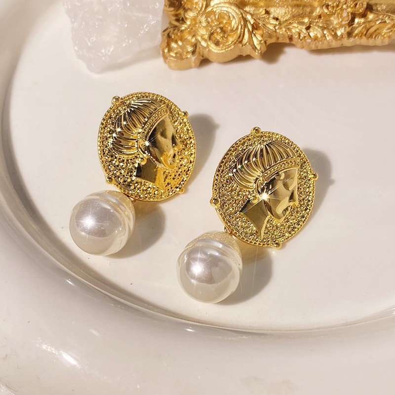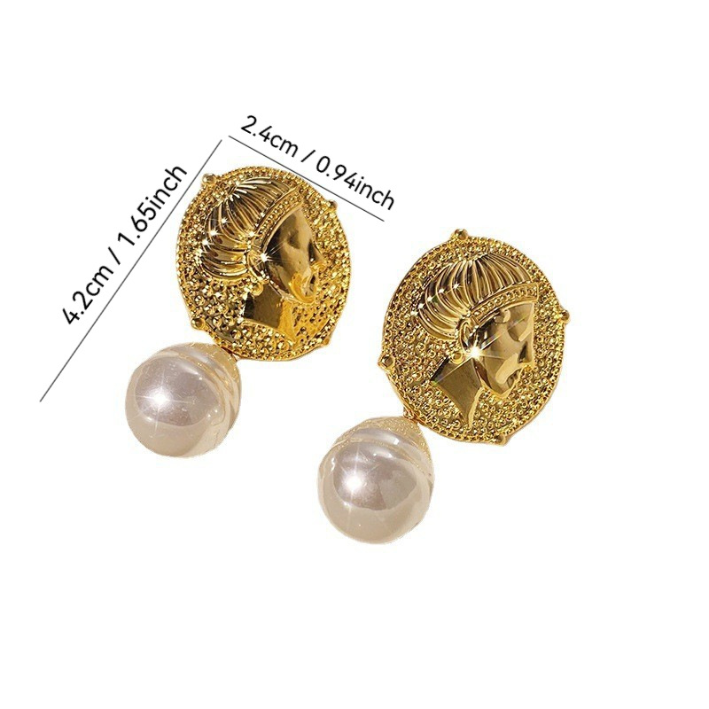 These refined earrings showcase a meticulously carved female portrait in antique gold finish, complemented by luminous pearl embellishments. Designed for women who appreciate vintage aesthetics, the retro-style earrings combine artistic craftsmanship with timeless elegance. Lightweight and suitable for daily wear or special occasions, they add a sophisticated touch to any ensemble.