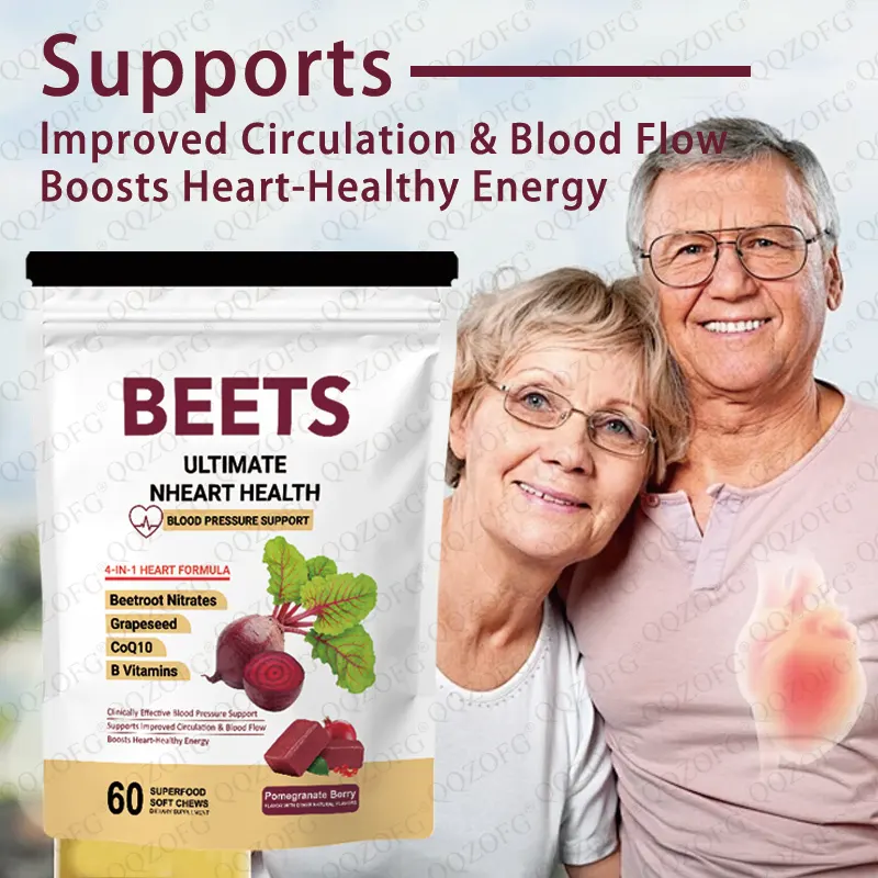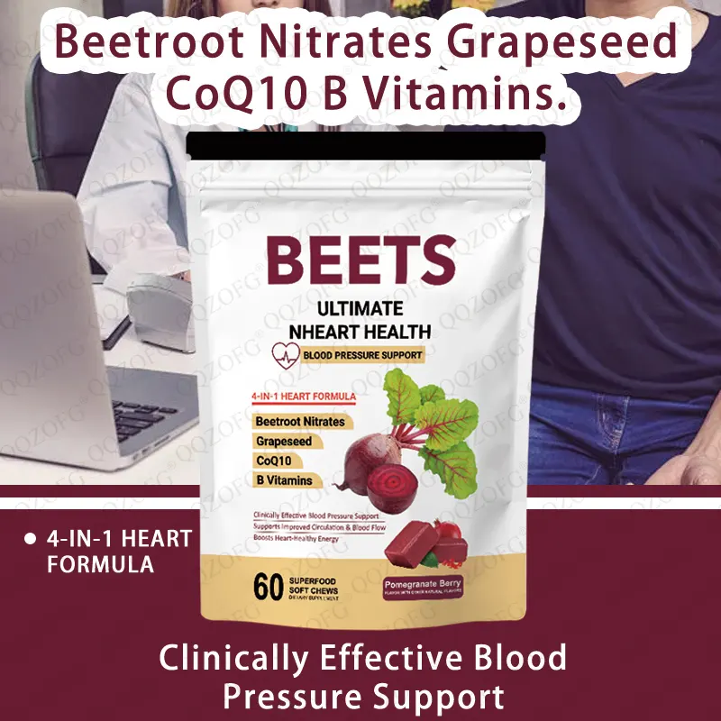 Pomegranate-berry soft chews that taste like candy but work like cardio support in a lab coat. Each chew floods your system with beet-root nitrates, CoQ10, grapeseed extract and high-dose B12 to boost nitric-oxide levels, promote flexible arteries and energize heart cells. Perfect for busy parents, gym-goers, or anyone who wants blood-pressure help without pills or powders. Grab, chew, and get on with your day.