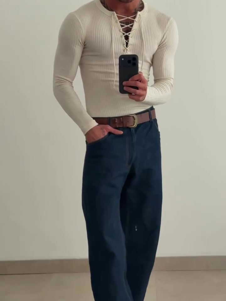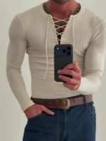 Stylish beige ribbed knit top with lace-up V-neck and long sleeves, combining comfort with elegant design for versatile wear.