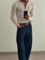 This beige ribbed knit top features a flattering V-neck design enhanced with lace-up detailing, adding a touch of elegance to its casual style. Crafted from soft, stretchable knit fabric, it offers both comfort and a fitted silhouette. The long sleeves provide additional coverage, making it suitable for transitional weather or layering. Its neutral beige color allows easy pairing with various outfits, ideal for both everyday wear and more refined occasions.