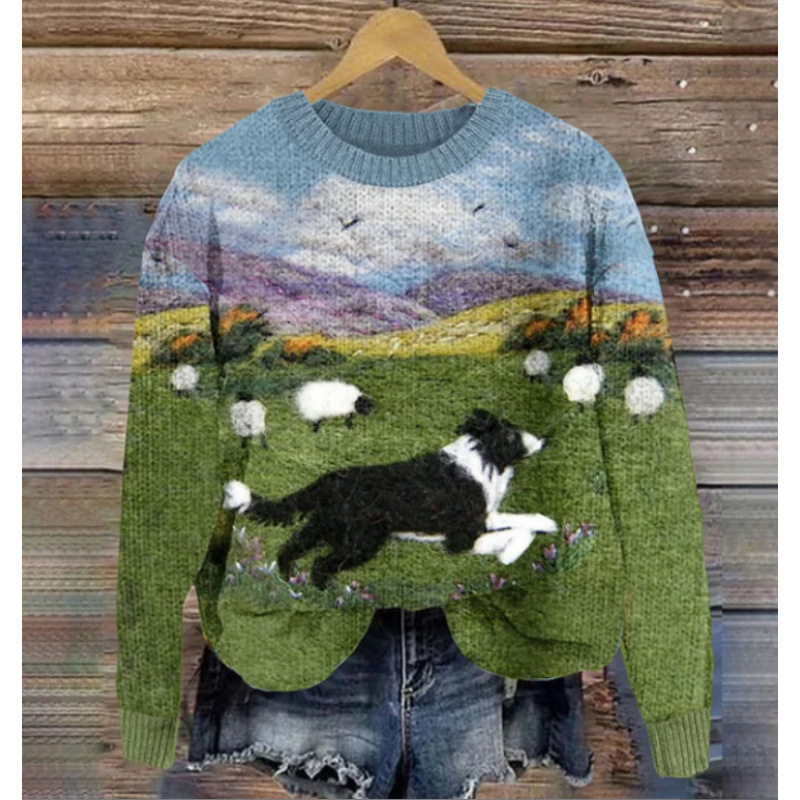 Stylish autumn women’s sweater featuring a unique print, perfect for seasonal comfort and casual wear.