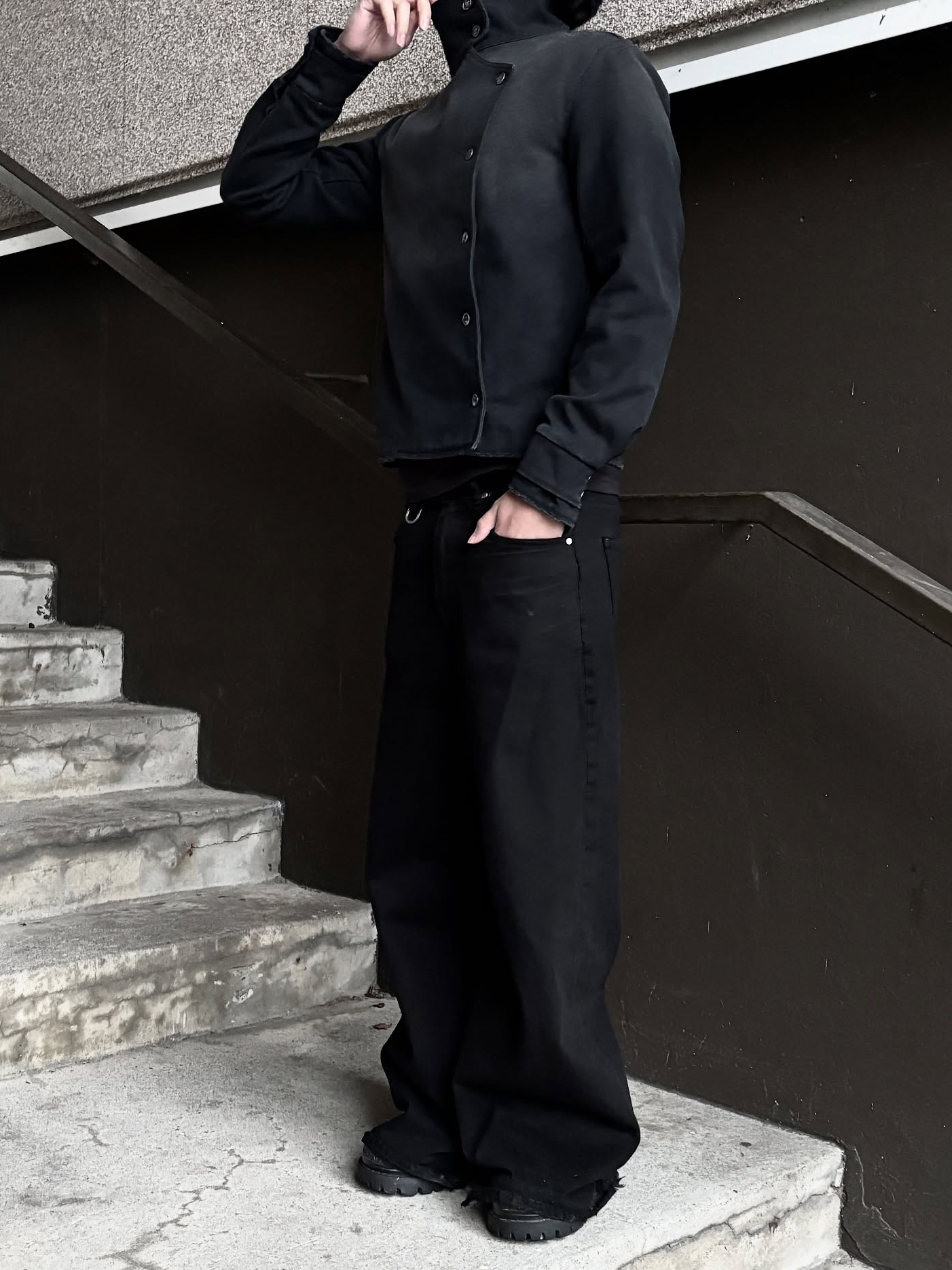 This black asymmetrical jacket features a distinctive stand collar and an elegant button closure design. Crafted from quality materials, it offers a contemporary silhouette that enhances any wardrobe with a modern edge. The asymmetrical cut adds sophistication and ensures a unique appearance, suitable for both casual and semi-formal occasions. Durable construction and attention to detail guarantee lasting wear and a polished finish.