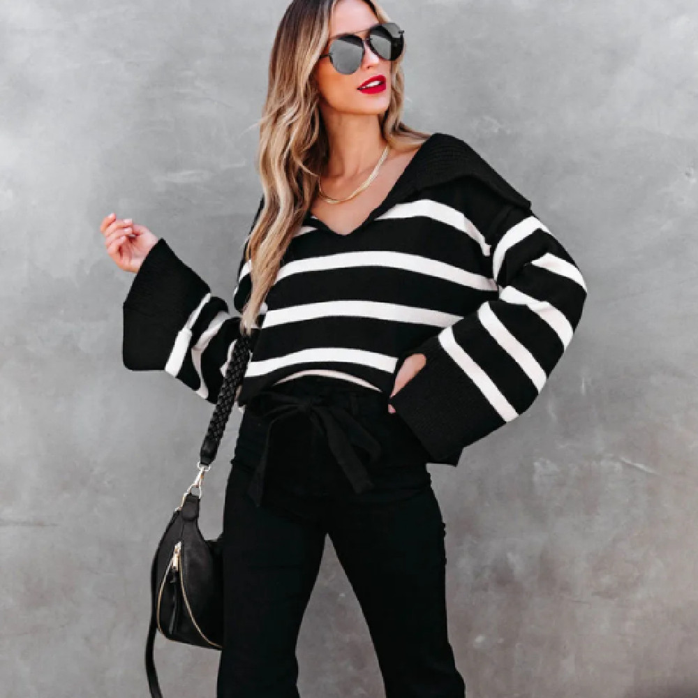 Be the first to review “Black Caped V Neck Slit Sleeve Striped Solid Sweater” Cancel reply
