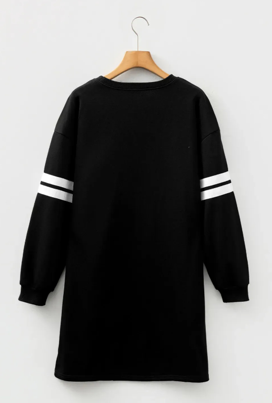This black sweatshirt dress combines festive charm with casual comfort, featuring a detailed sequin nutcracker graphic at the center. Designed with varsity-style striped sleeves, the dress offers a sporty yet seasonal aesthetic. Crafted from soft, durable fabric, it provides warmth and ease of movement, making it ideal for holiday gatherings or everyday wear during the winter season. The relaxed fit and pullover style ensure convenience while showcasing unique holiday-themed detailing.