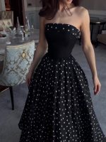 Elegant black strapless maxi dress featuring a classic polka dot pattern and a voluminous full skirt design.