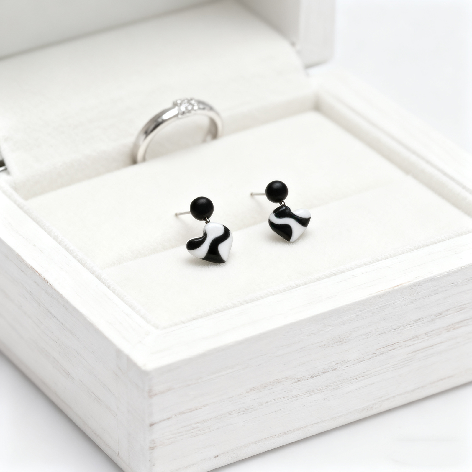 Elegant black and white heart-shaped earrings offering timeless style and sophistication for any occasion.
