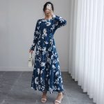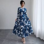 Be the first to review “Blue Long-sleeved Round-neck Waist-tied Slim-fit Printed Midi Dress” Cancel reply