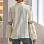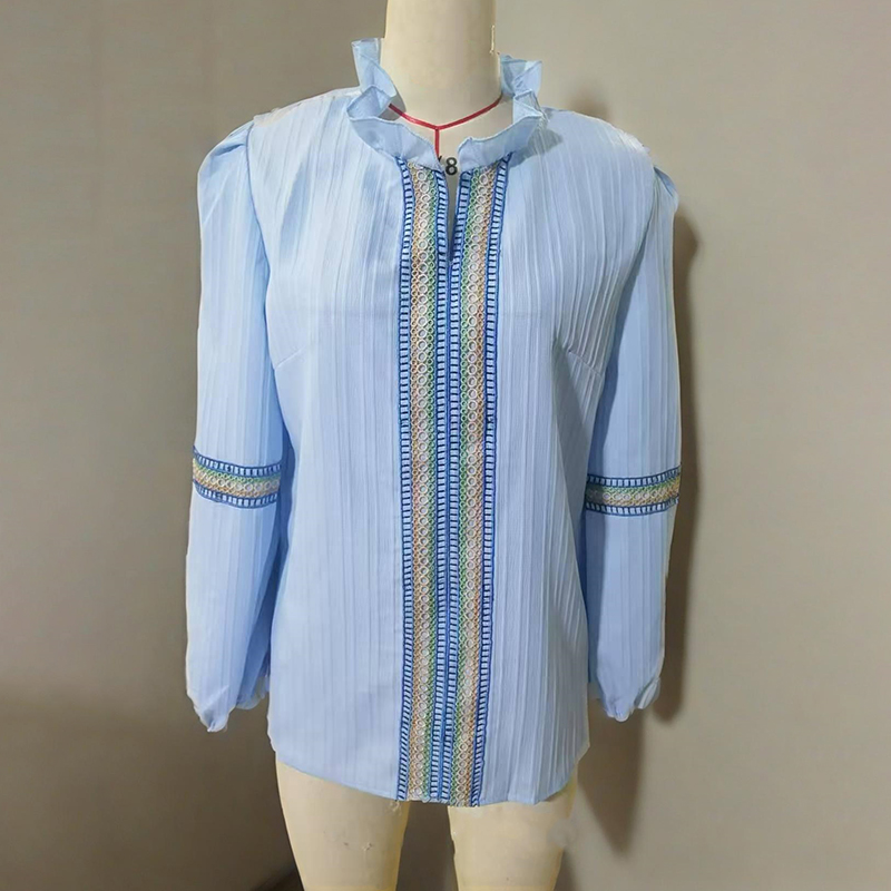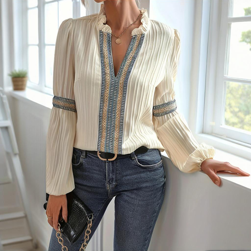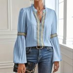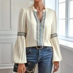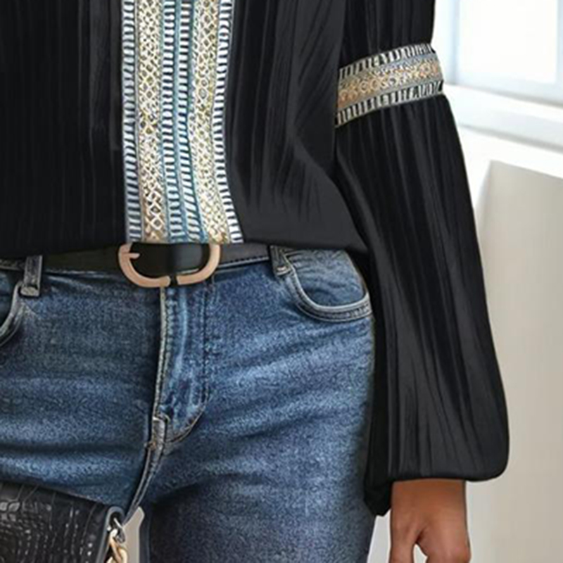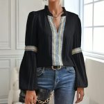 Elegant boho chic patchwork blouse featuring a V neck and lantern sleeves for a stylish, comfortable fit.
