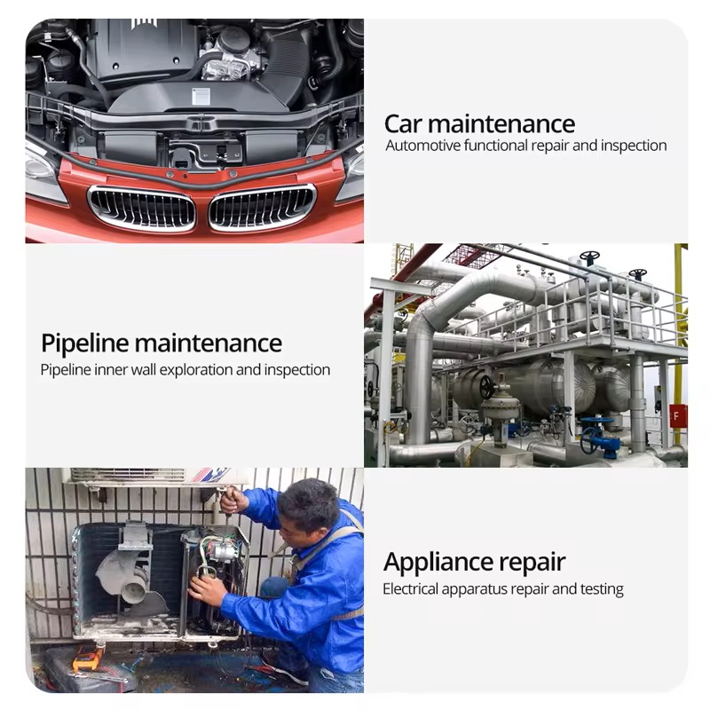 This industrial-grade borescope features an integrated LED light and a flexible snake cable available in lengths of 2, 5, and 10 meters, designed for thorough inspection in automotive, aircraft, and pipe environments. The portable endoscope provides clear and illuminated visuals in hard-to-reach areas, enhancing the efficiency of diagnostic and maintenance tasks. Its durable construction ensures reliable performance in various industrial applications.