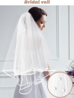This short, two-tier bridal veil is designed for elegance and practicality, ideal for weddings, bachelorette parties, bridal showers, and first communions. It includes twelve pairs of magnetic veil weights adorned with artificial pearls and silver buttons. These double-sided weights help maintain veil positioning, ensuring a smooth and graceful appearance throughout the event. Crafted to complement bridal attire, the veil combines delicate style with functional support for an effortless, refined look.