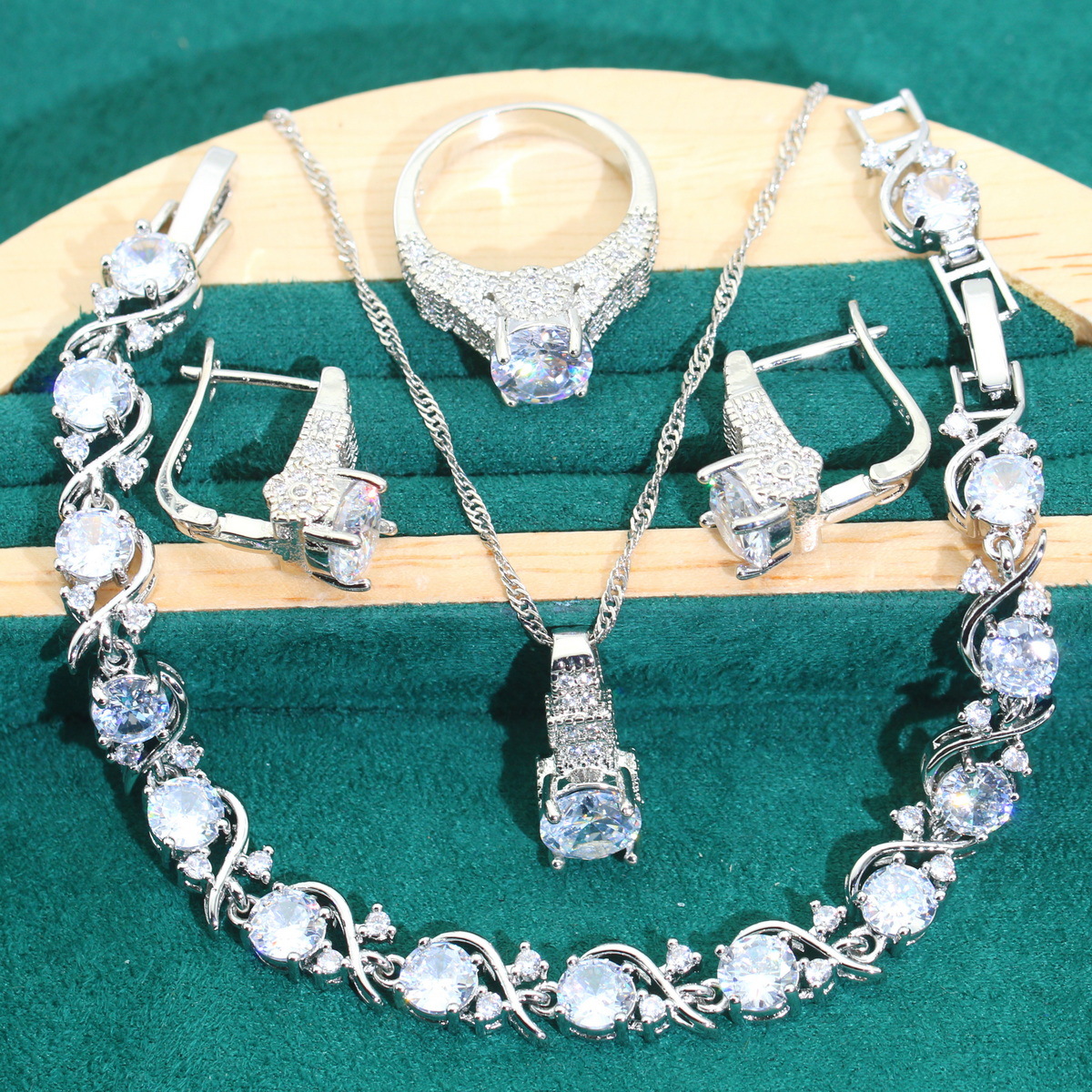Elegant bridal zircon jewelry set including necklace, bracelet, earrings, and ring, perfect for wedding dress accessories.