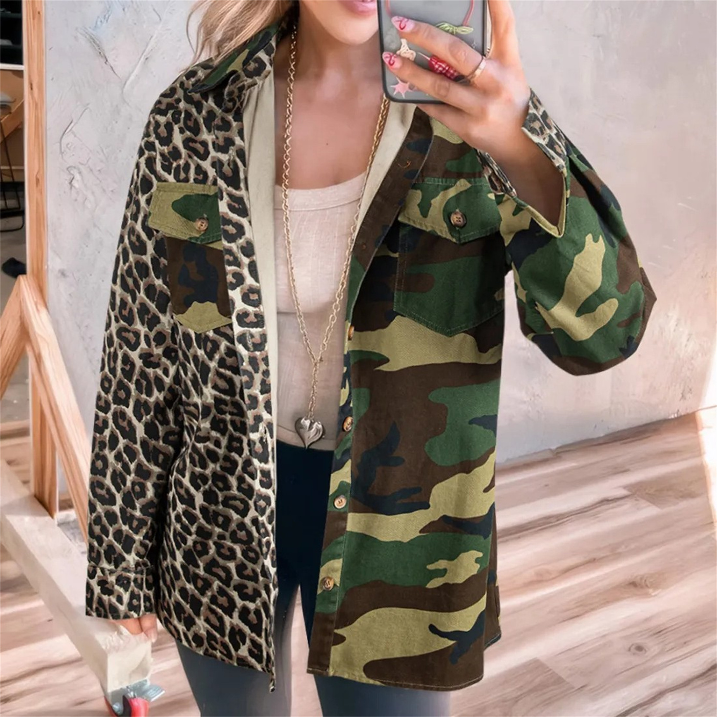 This brown oversize shacket combines the boldness of leopard print with camouflage patchwork, creating a unique and fashionable outerwear piece. Crafted from durable materials, it offers a relaxed, roomy fit suitable for layering in various weather conditions. The blend of patterns provides a distinctive style statement while maintaining comfort and versatility. Ideal for casual wear, this shacket balances trend and function with its lightweight yet warm construction.