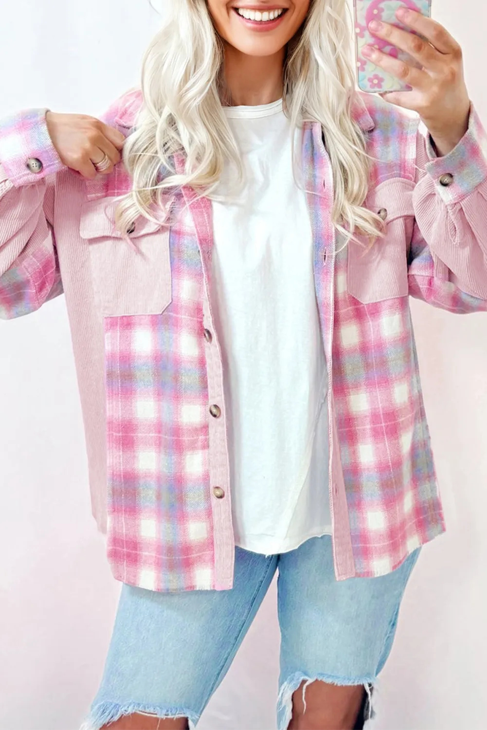 Stylish brushed plaid corduroy shacket featuring patchwork design and flap pockets for versatile layering and casual comfort.