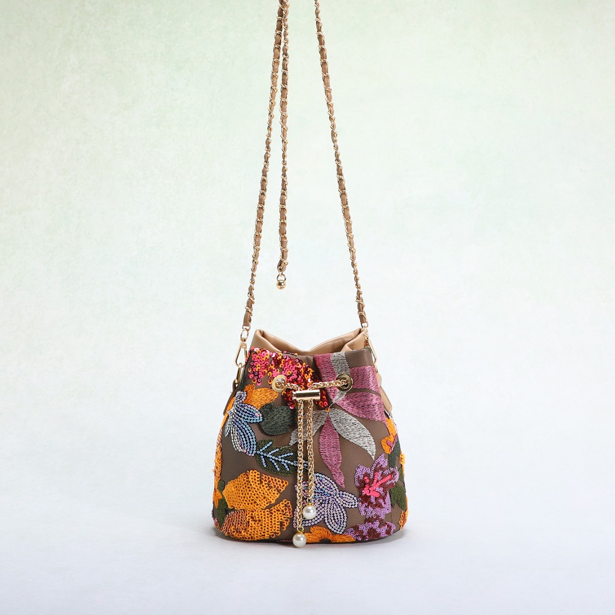 Elegant bucket bag featuring mesh patchwork, contrasting colors, drawstring closure, and a chain strap for versatile wear.