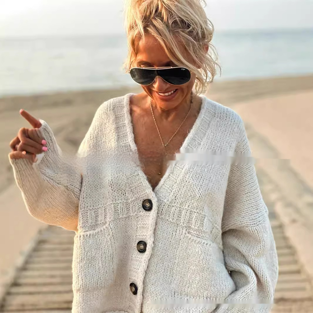 Elegant women’s cardigan featuring long sleeves, V-neck, button closure, and practical pockets for versatile style and comfort.