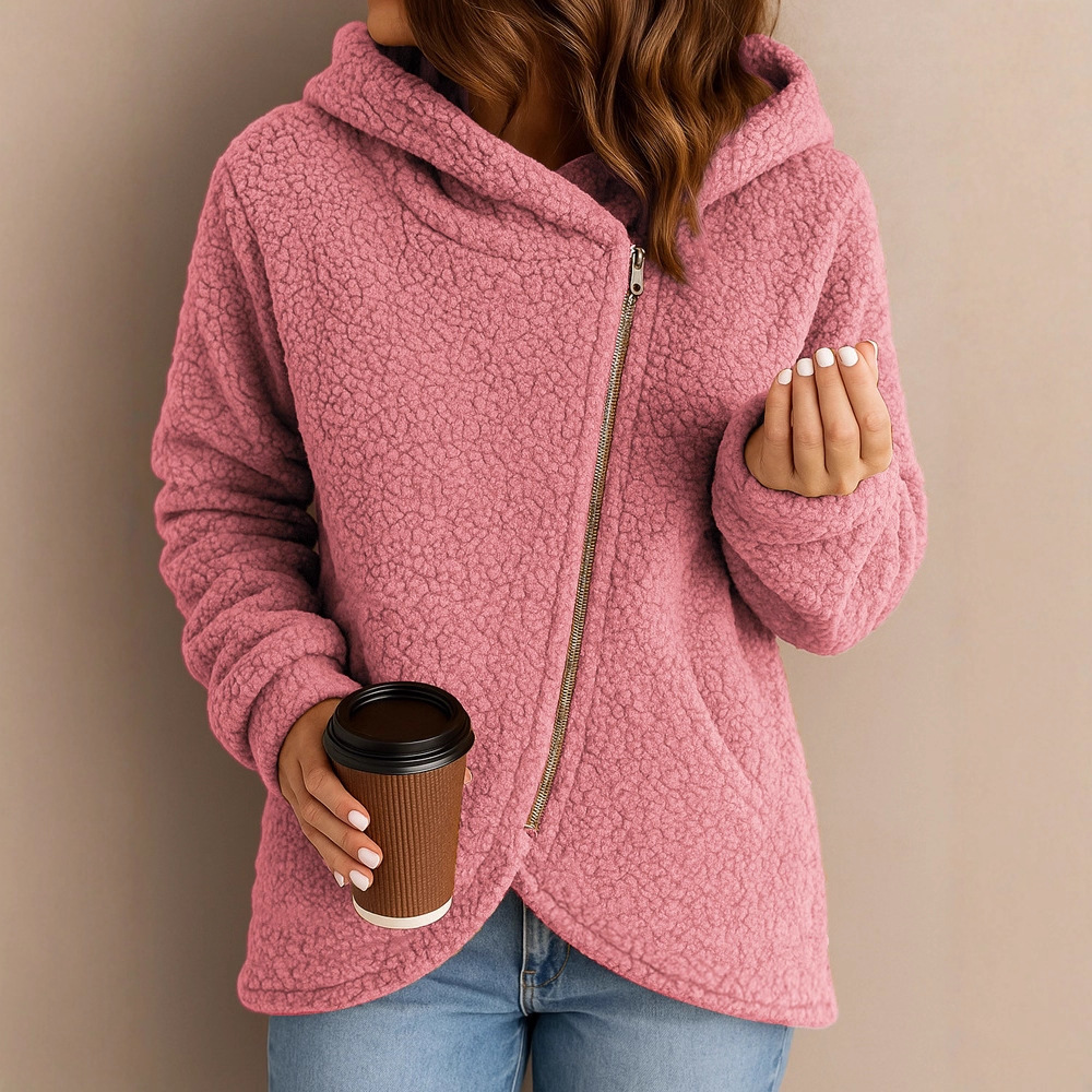 Comfortable casual lambswool hoodie coat with a loose fit, long sleeves, and front zipper closure for versatile everyday wear.