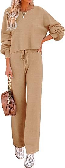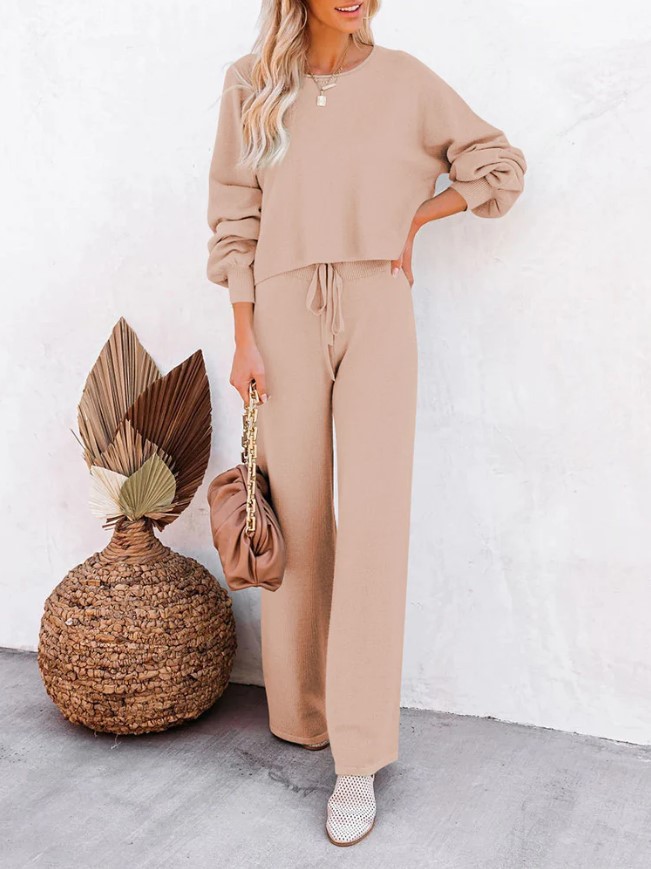 Comfortable casual two-piece set featuring solid color long-sleeved top and matching trousers for everyday wear.