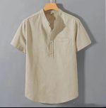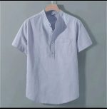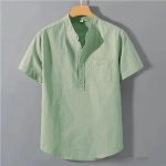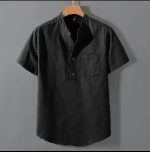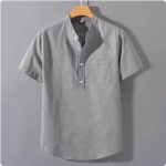 Lightweight casual short sleeve linen shirt with stand collar and solid color design, perfect for everyday wear.