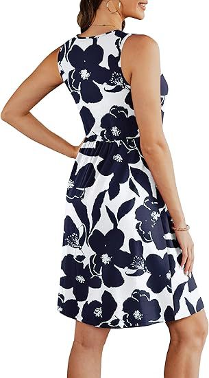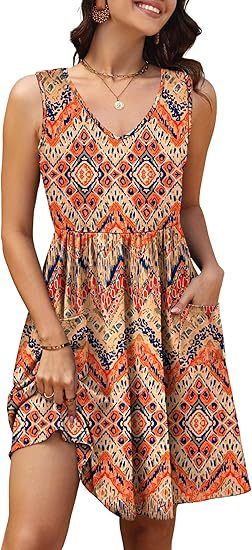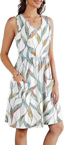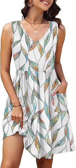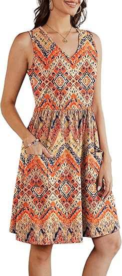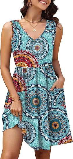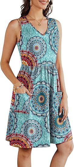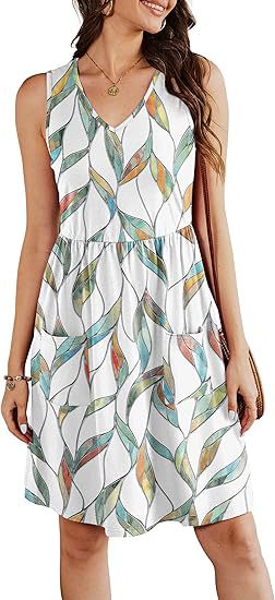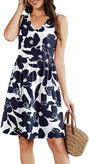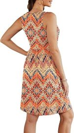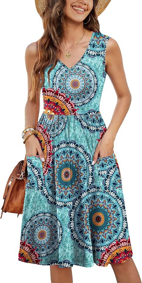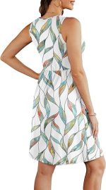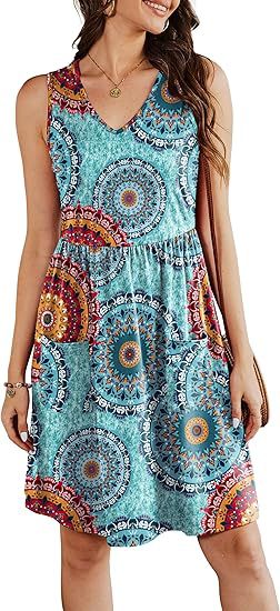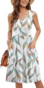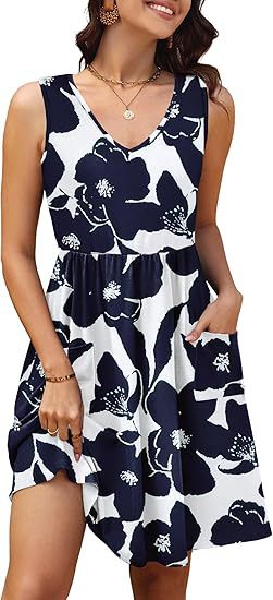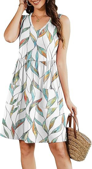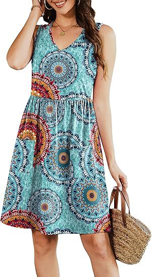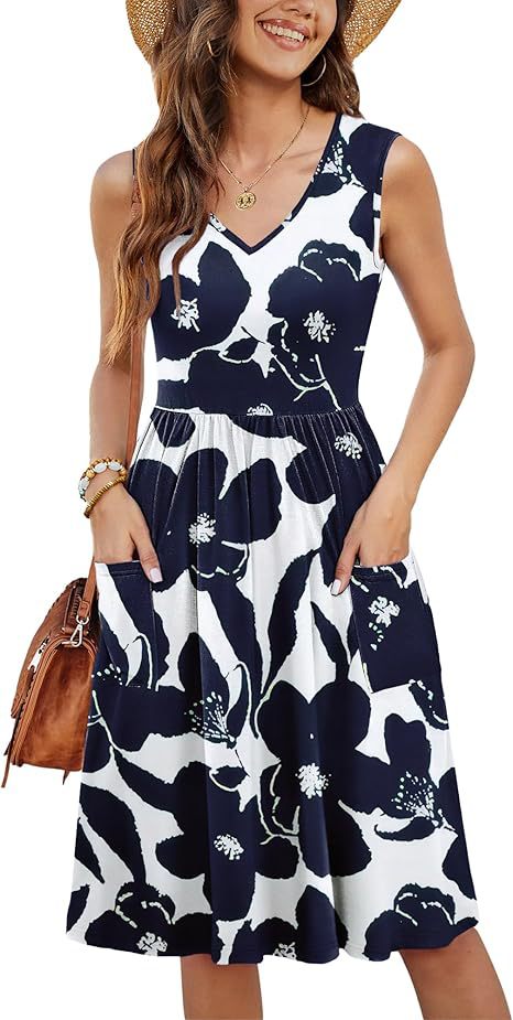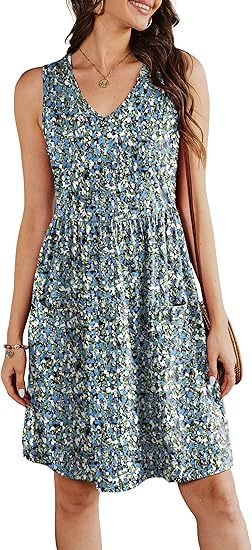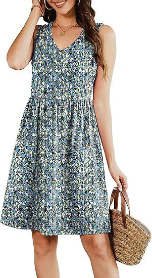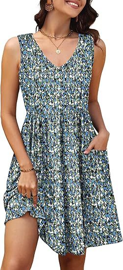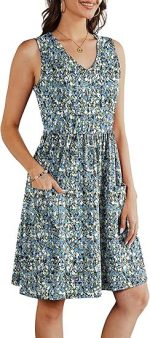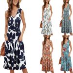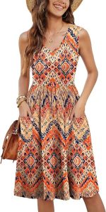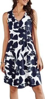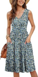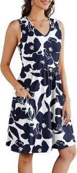 Lightweight casual women’s floral dress featuring a V-neck and practical pockets, ideal for holiday wear.