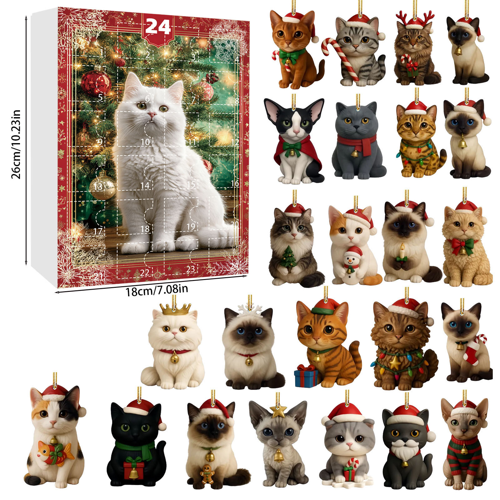 This advent calendar features a collection of cat-themed blind box decorations made from durable acrylic material. Designed to be hung on Christmas trees, each ornament offers a charming and festive addition for cat lovers. The lightweight and transparent acrylic construction ensures a graceful appearance while being sturdy enough for seasonal use. Ideal for enhancing holiday décor, this calendar combines the excitement of a blind box surprise with the joy of cat-inspired festive ornaments.