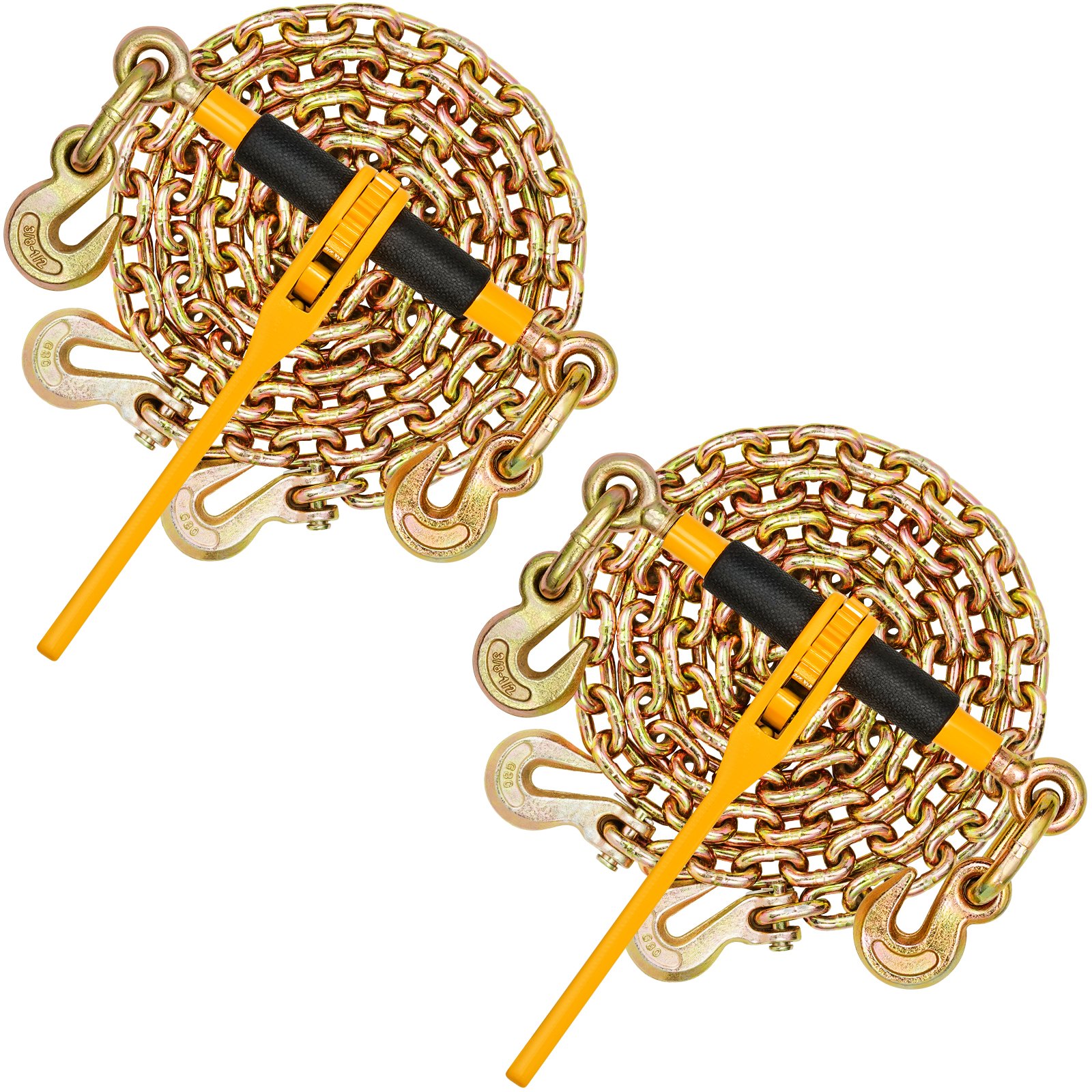 Durable 3/8″ G80 chains with 9200 lbs ratchet load binders, ideal for hauling, towing, and secure tie down applications.