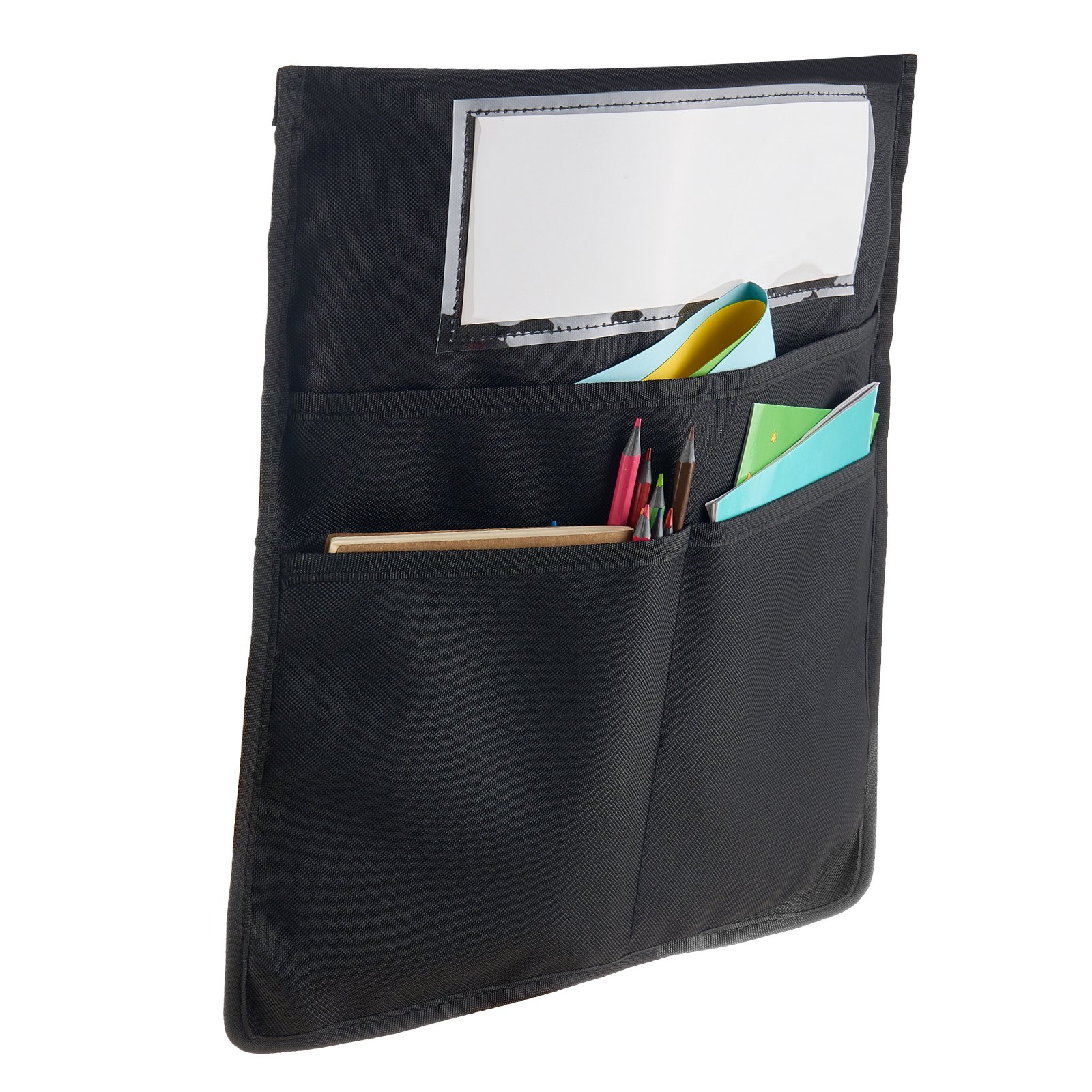 This set includes 12 black chair pockets designed for classroom use, providing convenient storage attached to seats. Each seat pocket features an integrated name tag slot for personalized labeling, facilitating easy organization and identification. Crafted from durable materials, these pockets help keep classroom essentials neatly stored and accessible, enhancing tidy and efficient learning environments. Ideal for storing books, stationery, and other small items directly on student chairs.