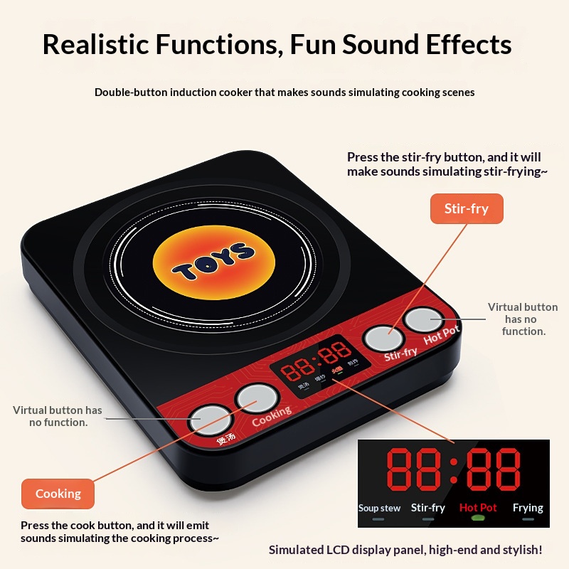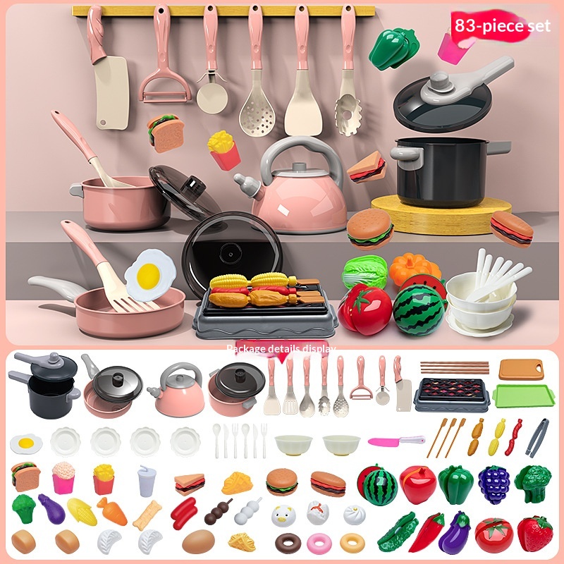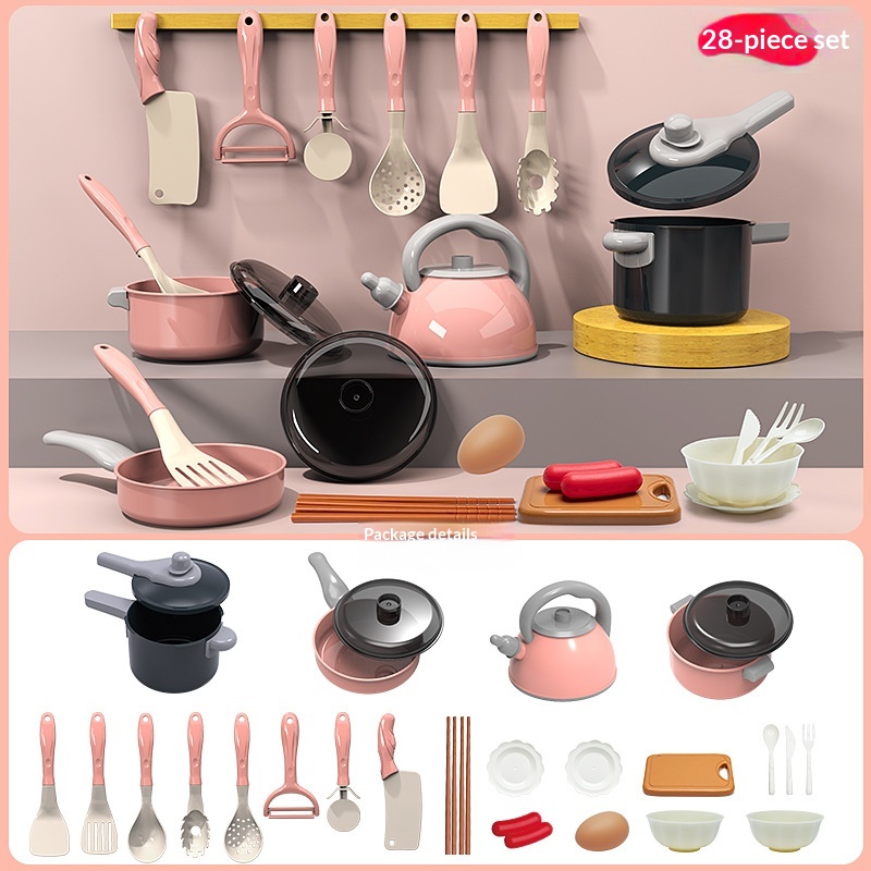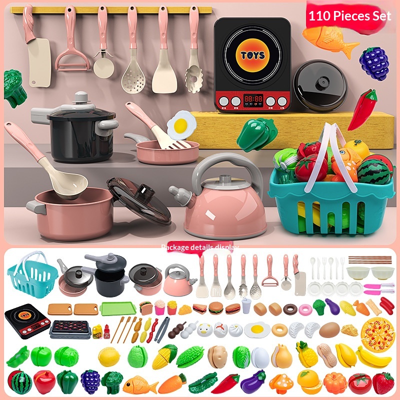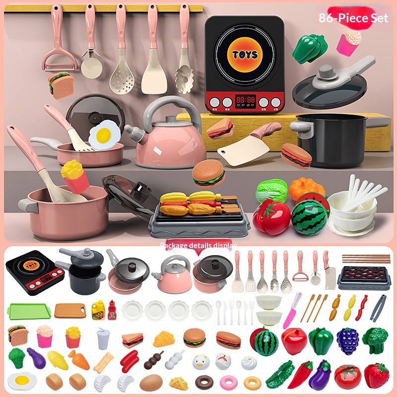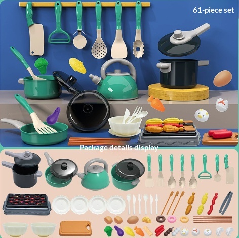 This simulated kitchenware playset is specifically designed for children to engage in cutting, cooking, and meal preparation activities. Crafted from safe, durable materials, it provides a realistic and interactive experience to enhance imaginative play. The set includes various utensils and food items that allow children to simulate cooking tasks, fostering creativity and practical skills in a fun, educational manner. Suitable for young kids, it encourages role-playing and improves hand-eye coordination while ensuring hours of safe entertainment.