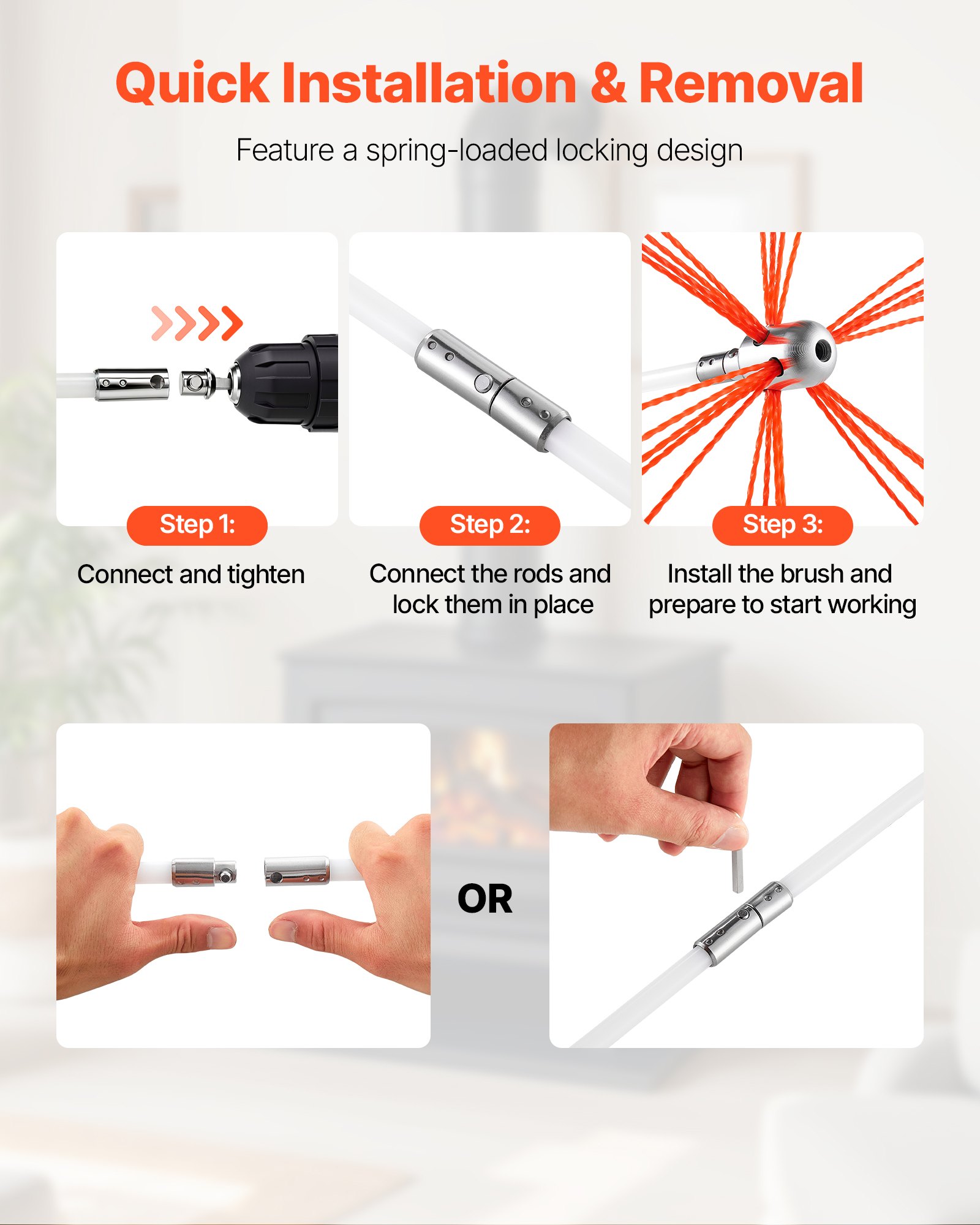 This Chimney Sweep Kit features a maximum extendable length of 23 feet, allowing thorough cleaning of chimneys with ease. It includes a durable chimney brush designed for both square and rectangular chimneys, accompanied by replacement bristles for sustained maintenance. The kit also comes with protective goggles for safety during operation. A 90° bendable fireplace cleaning tool enhances maneuverability to reach difficult areas, ensuring an efficient and comprehensive cleaning process.