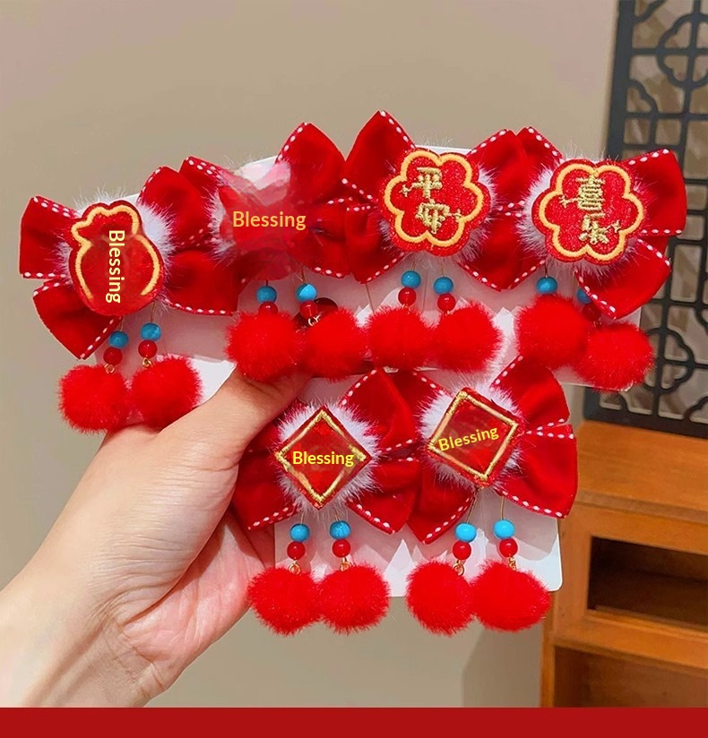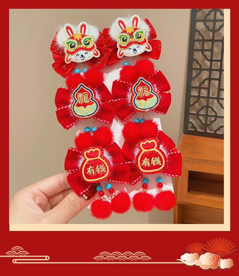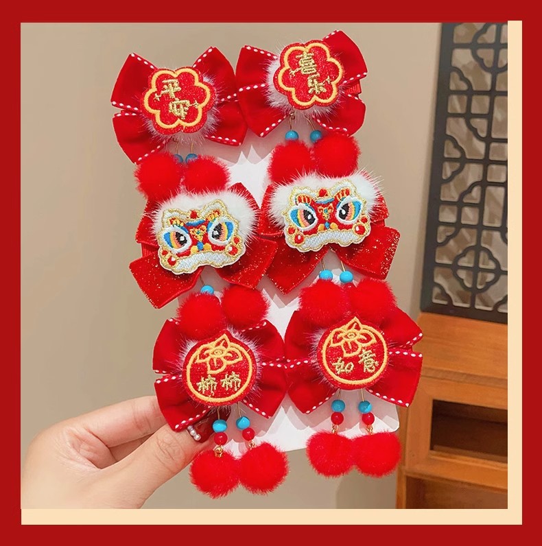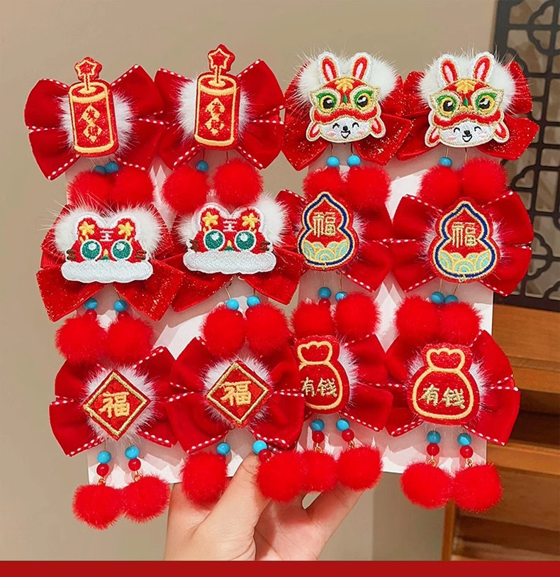 Traditional Chinese lion dance themed bow-tie hair clip featuring tassels and pom-poms, designed for children’s festive hairstyles.