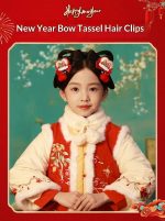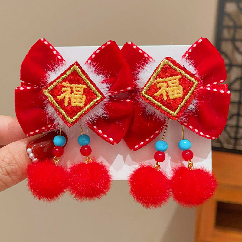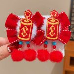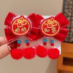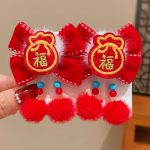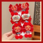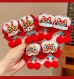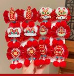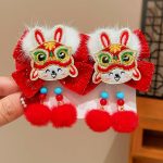 Traditional Chinese lion dance themed bow-tie hair clip featuring tassels and pom-poms, designed for children’s festive hairstyles.
