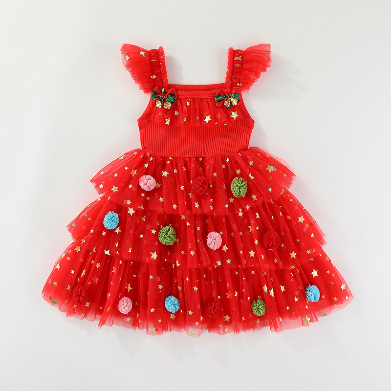 Elegant girls’ Christmas dress featuring a festive mesh skirt, perfect for holiday celebrations and special occasions.