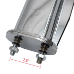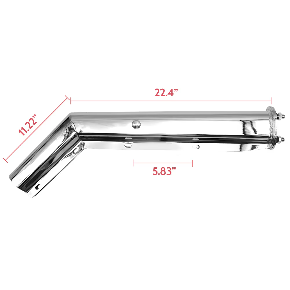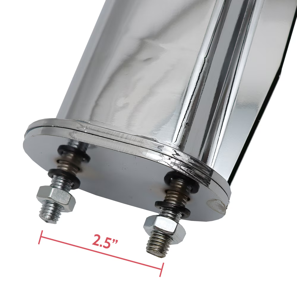 This set includes two chrome angled mud flap hanger brackets designed for semi trucks, featuring a bolt spacing of 2.5 inches and a length of 30 inches. Constructed from heavy-duty materials, these spring-loaded hangers ensure secure and resilient attachment of mud flaps. Each hanger is equipped with reflective strip stickers to enhance visibility and safety. The package contains brackets for both the right and left sides, offering comprehensive protection and durability for commercial vehicle applications.
