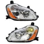 This set of chrome headlights is designed specifically for Kenworth T680 trucks manufactured between 2013 and 2021. The package includes a pair of durable headlights with integrated bulbs, ensuring optimal illumination and compatibility. Crafted to meet the exact specifications of the original equipment, these headlights deliver improved visibility and a sleek appearance, enhancing both safety and aesthetics. Easy to install and built from robust materials, they provide reliable performance and long-lasting use under various driving conditions.