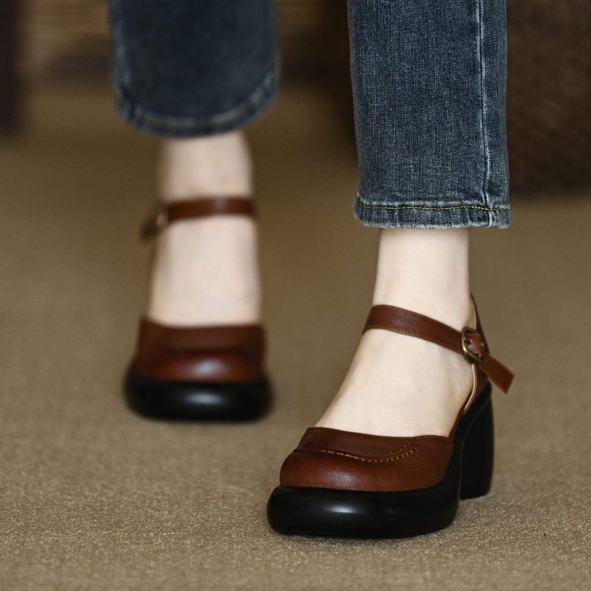 Elegant closed toe ankle-strap shoes featuring a thick heel and shallow mouth design for comfort and style.