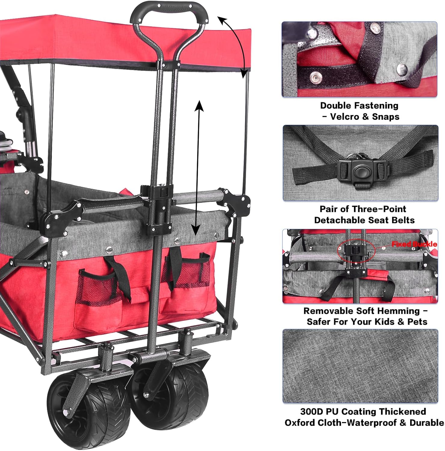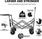 Versatile 140L foldable wagon with wheels, brake system, removable canopy, and cooler bag for camping, beach, shopping, and all-terrain use.
