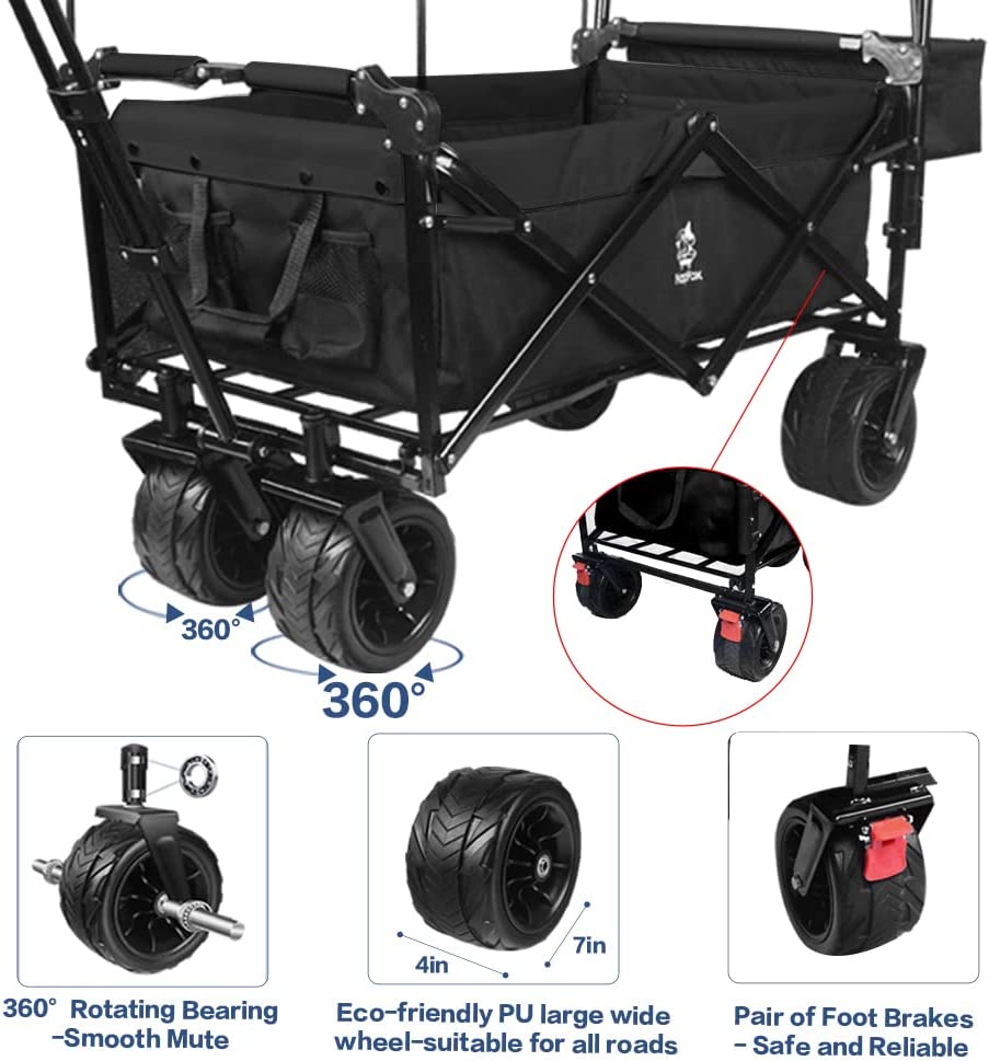 Durable 140L collapsible wagon with canopy, all-terrain wheels, brake, and cooler bag, ideal for camping, beach, and shopping needs.