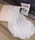 This two-piece pajama set includes comfortable shorts paired with suspenders detailed with wooden ear crimps, offering a unique and stylish design. Crafted from soft fabric, the set ensures ease and breathability, making it ideal for relaxing at home or sleepwear. The adjustable suspenders provide a secure fit, while the shorts offer unrestricted movement and comfort. This combination of functionality and distinctive design elements makes the set suitable for those seeking both comfort and charm in their loungewear collection.