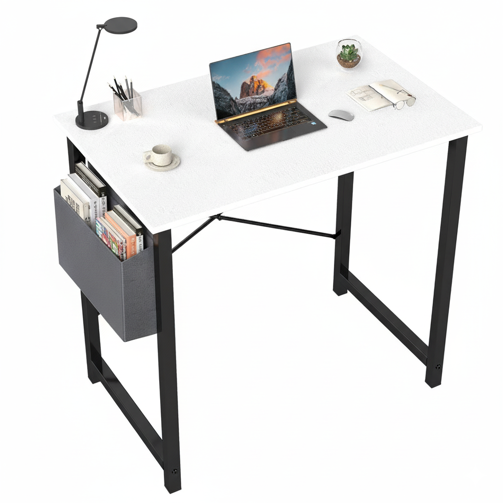 Sturdy computer desk featuring a steel frame, wooden tabletop, and fabric storage bag for efficient organization and durability.