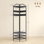 This Industrial Corner Hall Tree offers functional storage with a sleek black finish, designed to fit compact spaces efficiently. It features four sturdy tiers, including two spacious shelves suitable for footwear or other items. Equipped with eight adjustable hooks, the rack provides versatile options for hanging coats, hats, and bags. Crafted to optimize hallway organization while maintaining a modern industrial aesthetic, this coat rack combines durability and practicality in a corner-friendly design.