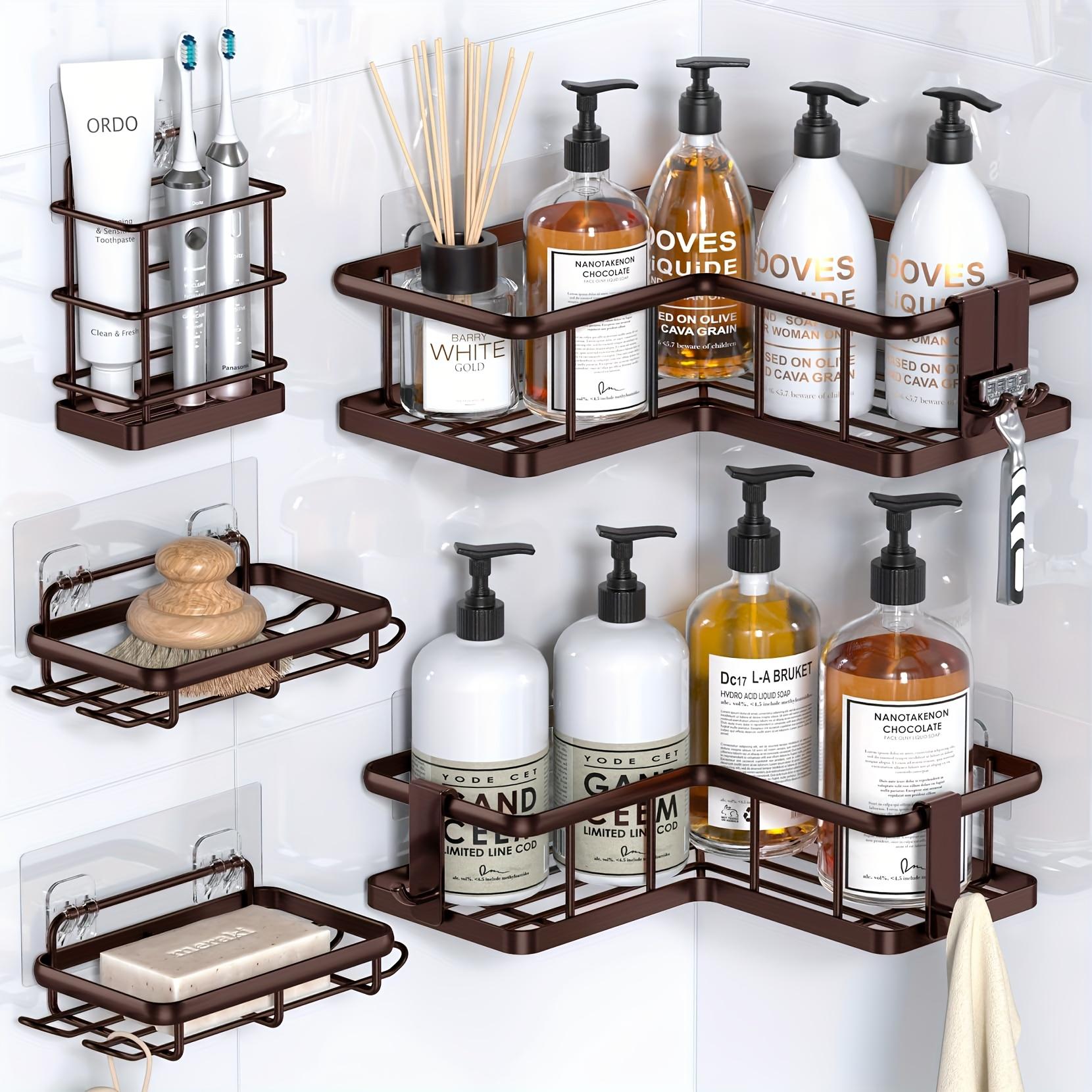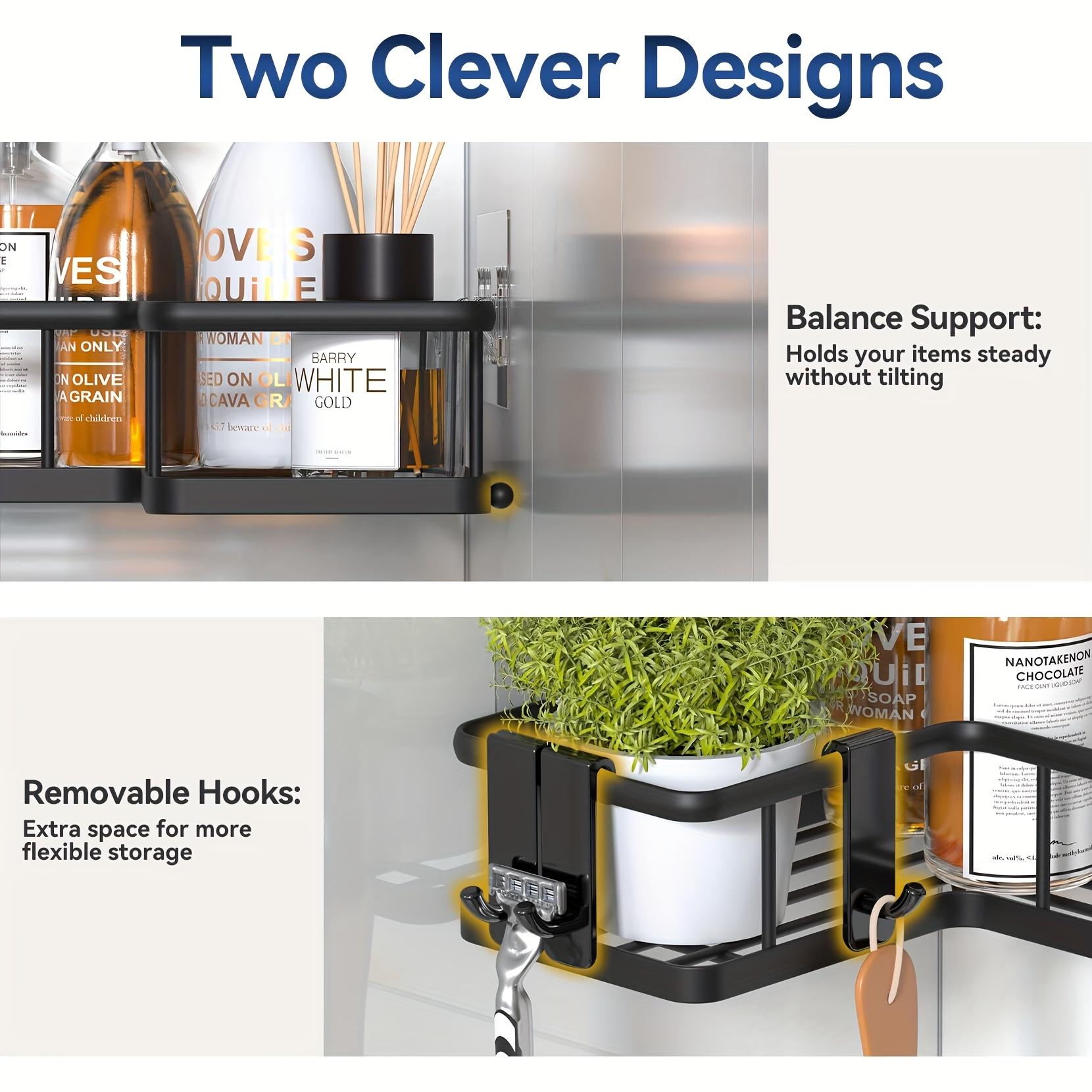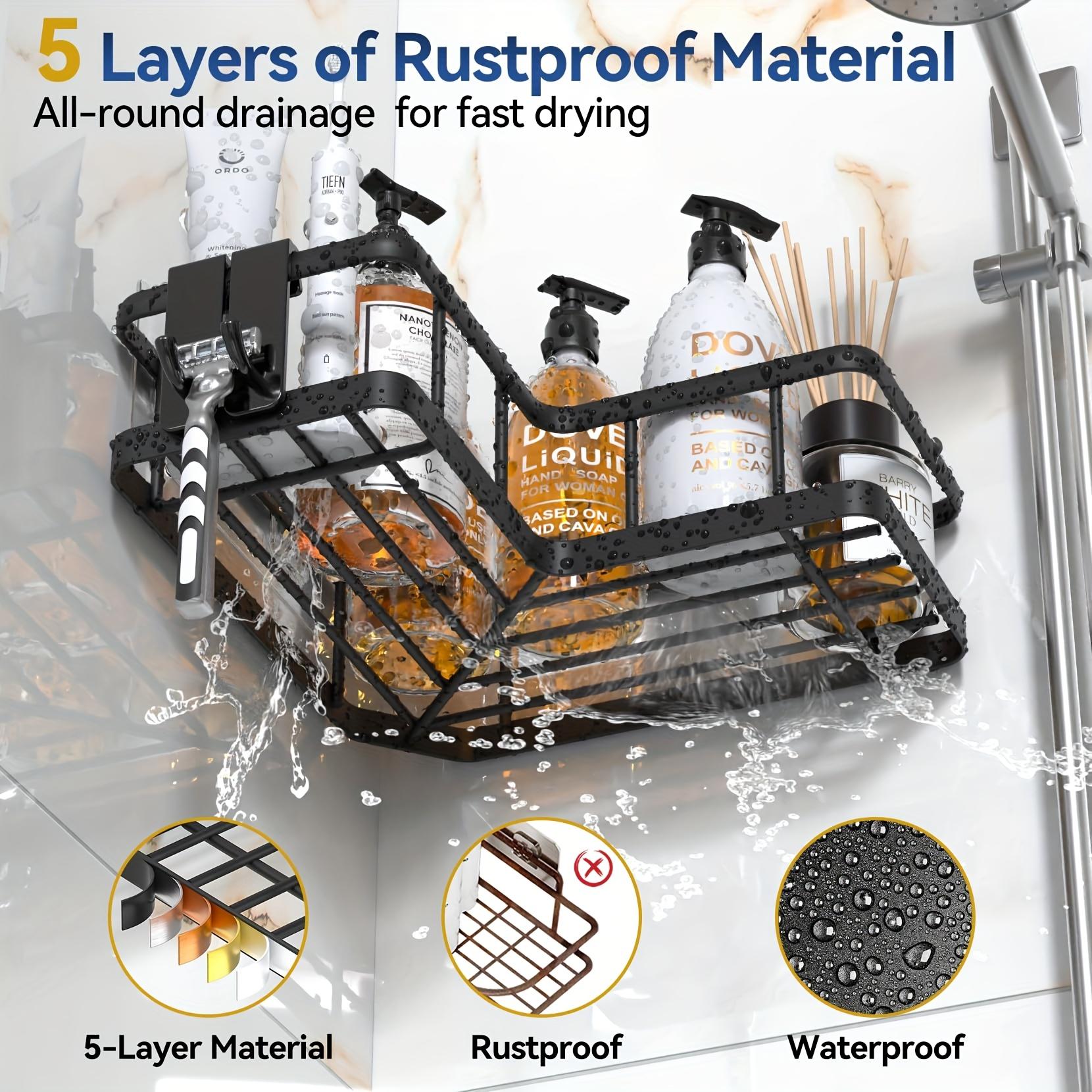 Durable rust-resistant corner shower rack with punch-free installation, soap holder, and removable hooks for organized bathroom storage.