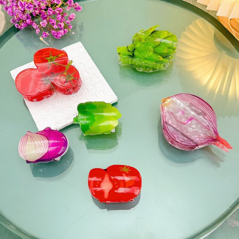 This collection of acrylic hair clips showcases charming fruit and vegetable motifs, designed to add a playful touch to any hairstyle. Crafted from durable acrylic material, each clip offers a lightweight and sturdy accessory suitable for daily wear. The vibrant colors and detailed designs enhance hair styling options, making them ideal for casual or themed occasions. Their secure grip ensures comfort and ease of use for various hair types.
