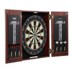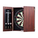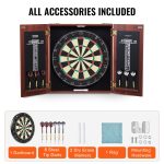 Features & Details Official Size & Refined Look: This dartboard cabinet is perfect for both recreational and competitive play. Enhance your skills with an official size dartboard and offers a premium playing experience. 18″ Diameter Dartboard: Equipped with an 18-inch diameter dartboard made from self-healing sisal fiber, this dartboard and cabinet set is designed for durability and extended use. The high-density material and staple-free bullseye prevent darts from bouncing off, while the rotatable steel number ring helps prolong the board’s lifespan. Classic Scoring: Track your game effortlessly with the classic black scoreboard, which is easy to wipe clean. The darts and dartboard set includes quality steel tip darts with grooves and rings for a consistent grip, along with dart holders to store your darts when not in use. Retro Style Cabinet: Enhance your living room décor with this retro-style cabinet. The dust-proof design, attractive woodgrain finish, and flannelette cloth that protects the board all contribute to its stylish and functional appearance. All Accessories Included: The dartboard and cabinet set comes complete with everything you need: 1 dartboard, 6 steel tip darts, 2 dry erase markers, 1 cleaning rag, and mounting hardware. Assembly is straightforward, ensuring you can start playing in no time.